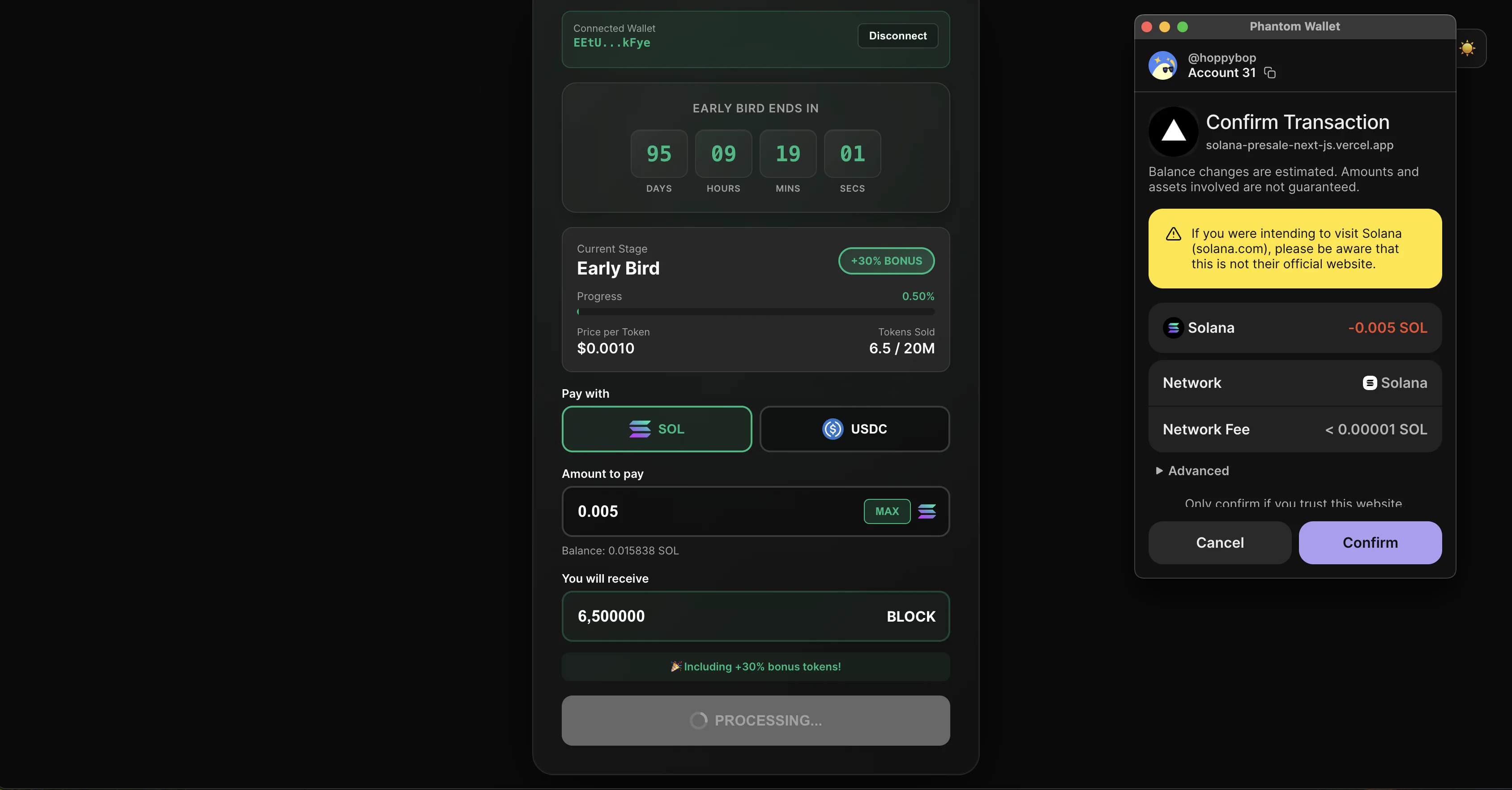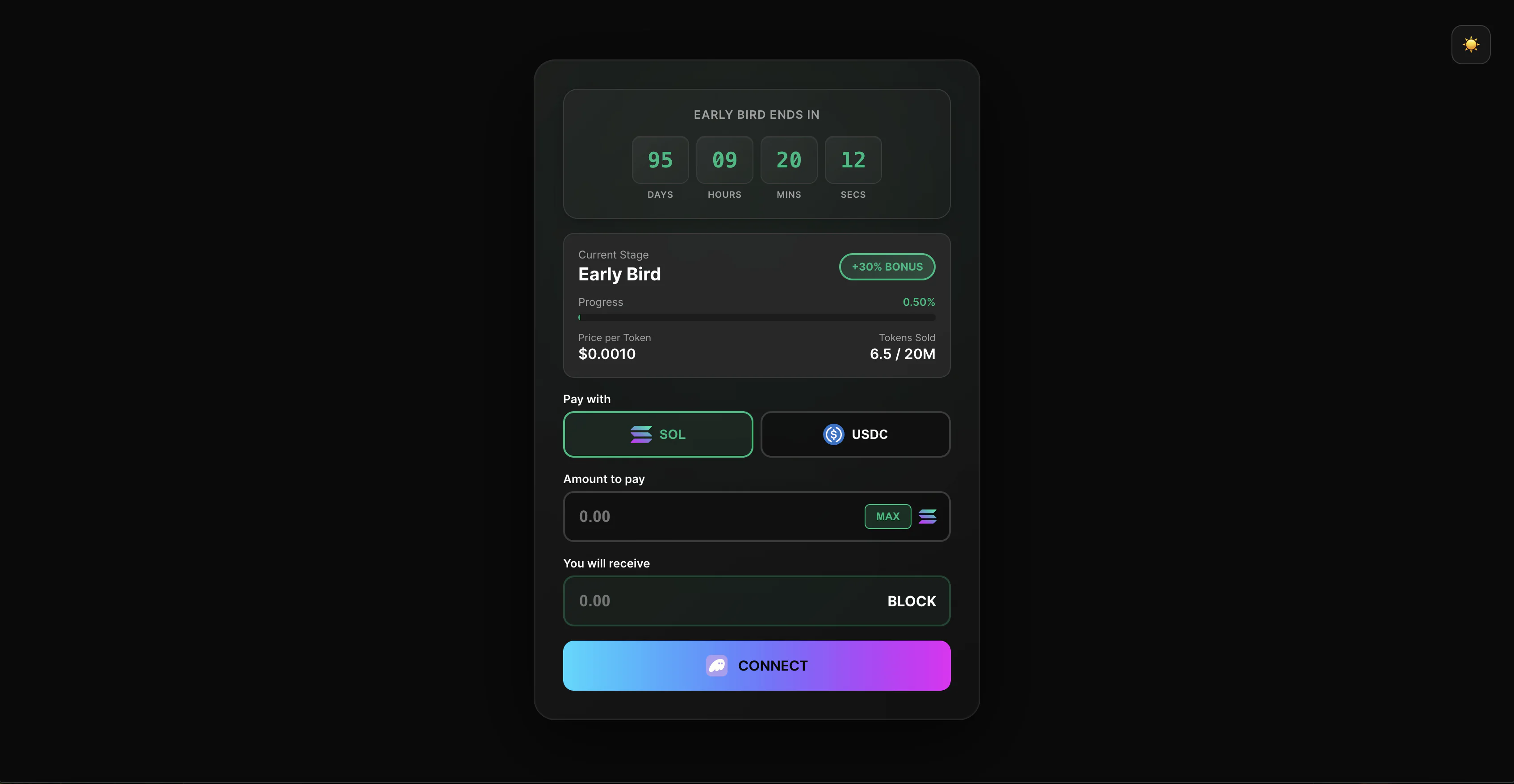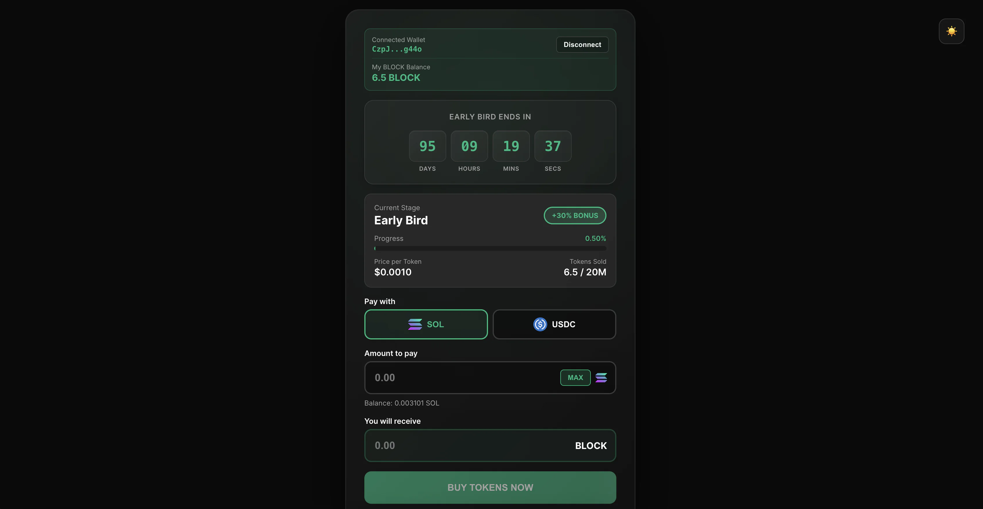 - Token type (SOL/USDC)