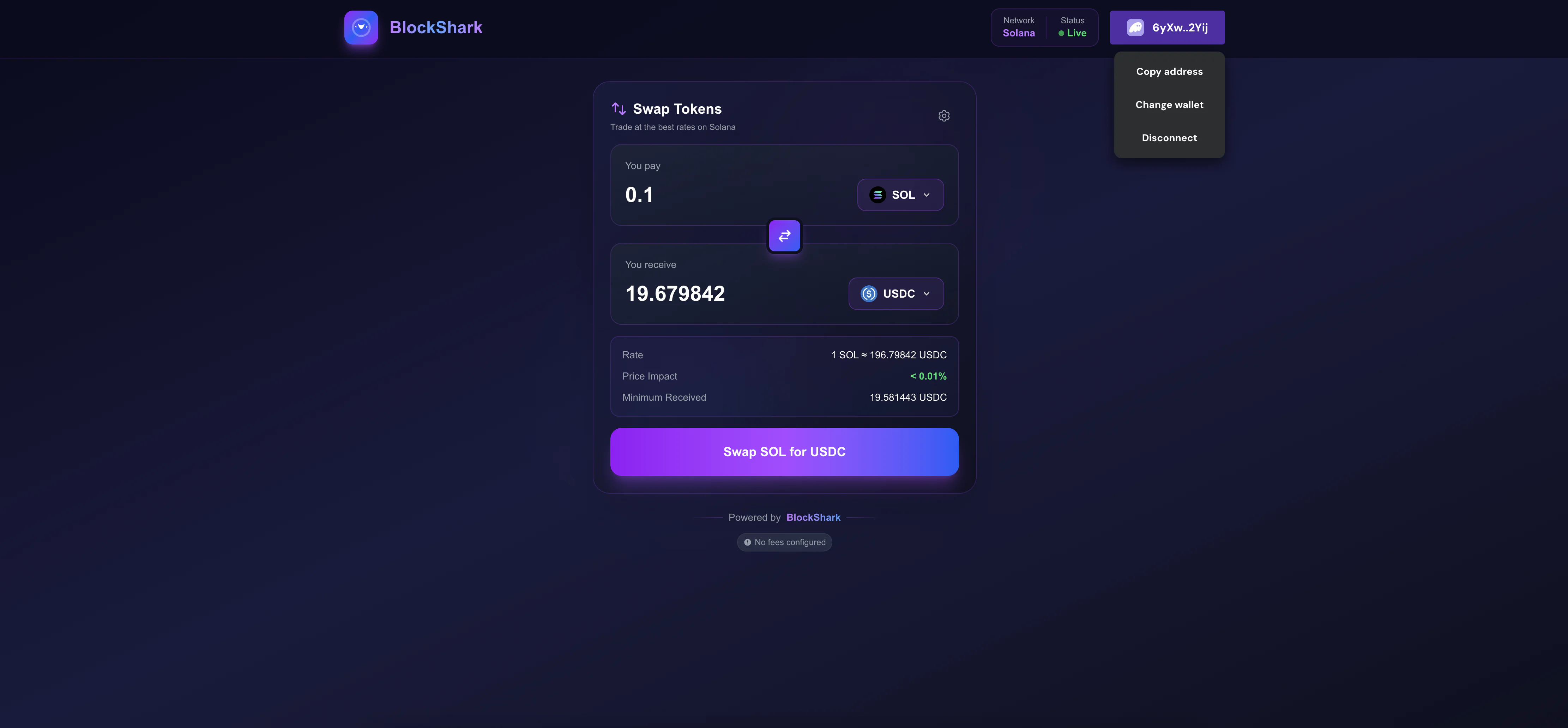 - Prebuilt swap flow integrated with a Solana DEX aggregator.